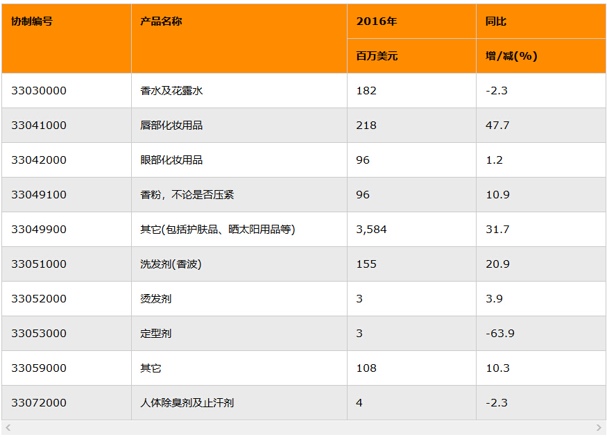 13. 2016年中國主要化妝品進(jìn)口摘要如下: